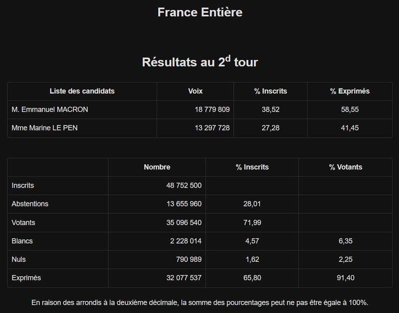 Макрон набрав 58,55% голосів виборців, а за Ле Пен проголосувало 41,45% французів.