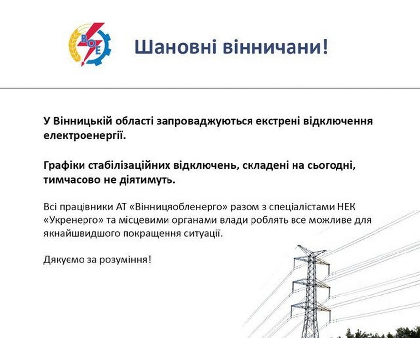 У зв’язку з цим НЕК «Укренерго» доведено додаткове обмеження граничного рівня споживання потужності для Вінницької області.