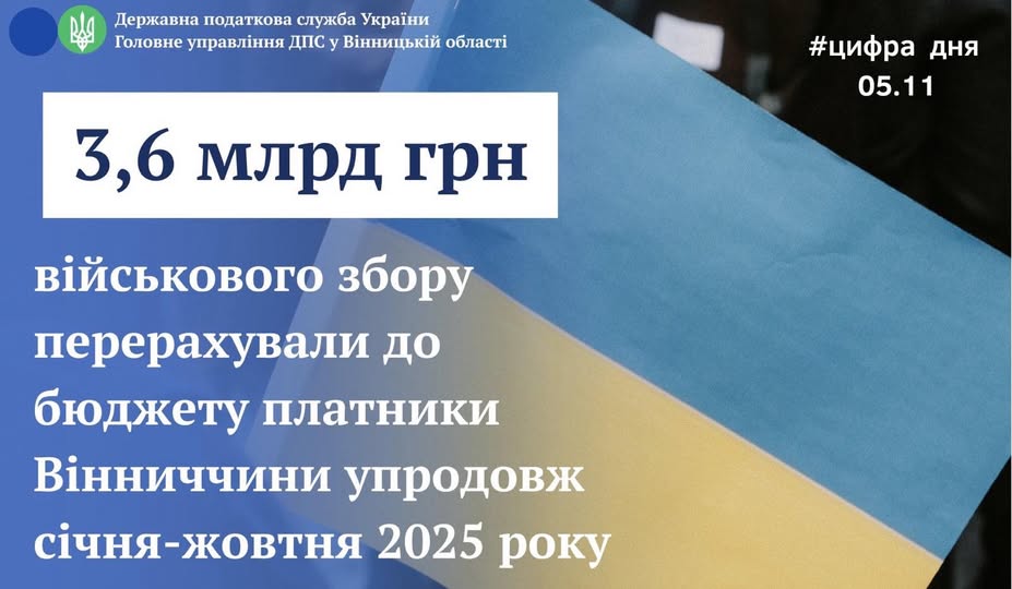 За підсумками січня-жовтня 2025 року на потреби оборони нашої держави Вінниччина перерахувала до державного бюджету більш ніж 3,6 млрд грн військового збору.
