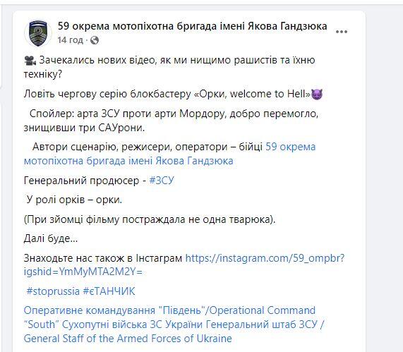 У 59 окремій мотопіхотній бригаді імені Якова Гандзюка оприлюднили нове відео про те, як бійці бригади завдали чергових втрат рашистам. У коментарі під відео бійці повідомили, що продовжуватимуть знищувати орків, а відео звіти викладатимуть у мережу на радість українцям і на страх ворогам.