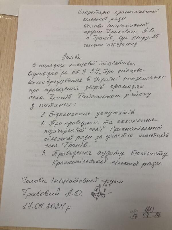 Секретар Краснопільської сільської ради Марія Дерманська повідомила, що дійсно, 16 квітня у сільську раду ініціативна група мешканців принесла повідомлення про проведення цих зборів. Наступного дня вони принесли інше звернення, коректніше написане.