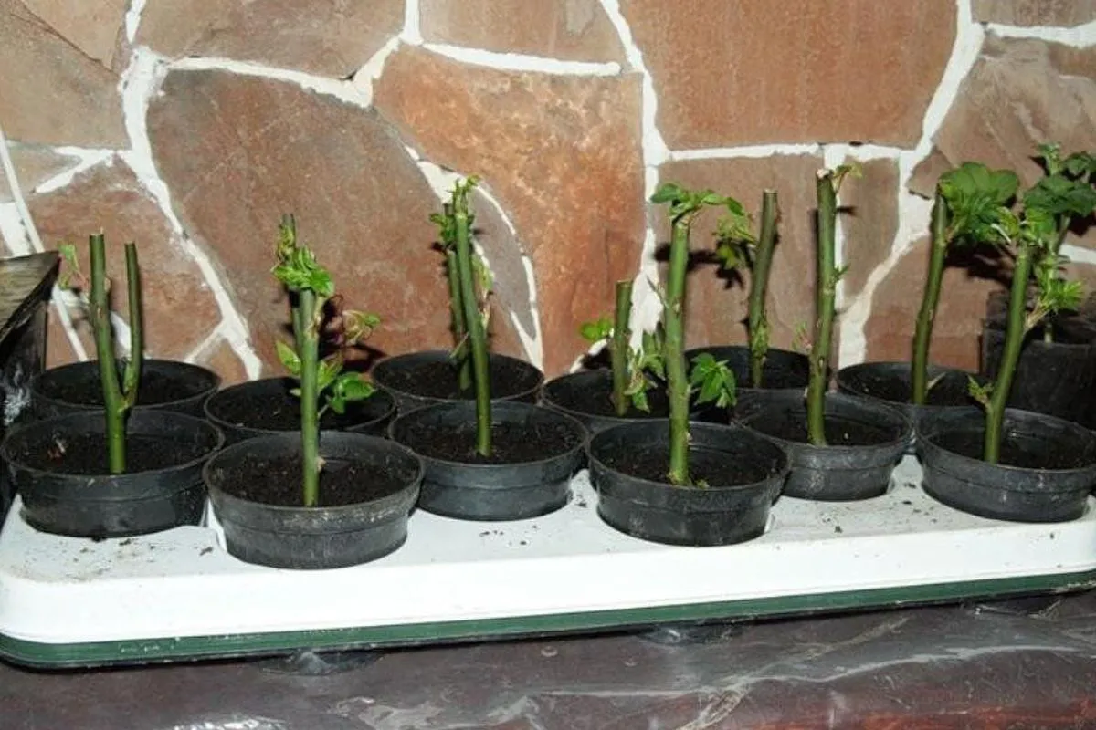 Нарізають живці гострим інструментом, зрізи повинні бути рівними та гладкими. На кожному живці залишають 3-4 бруньки, верхню частину пагона для вкорінення не використовують. Знизу роблять косий зріз між брунькою і шипом, верх можна обрізати прямо або під кутом 45 градусів – на укорінення це не впливає (відстань від бруньки до зрізу – 1 см). Листя з пагона видаляють або сильно вкорочують.