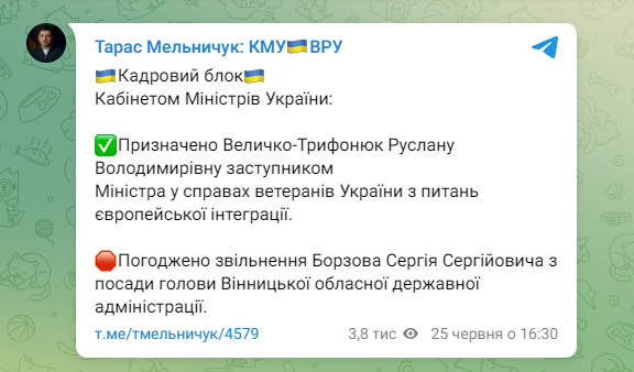 «Погоджено звільнення Борзова Сергія Сергійовича з посади голови Вінницької обласної державної адміністрації», – повідомив Тарас Мельничук.