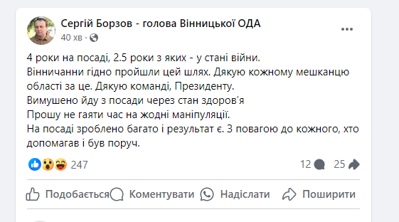 Сергій Борзов у соцмережах теж прокоментував своє звільнення. Він стверджує, що пішов з посади через хворобу. І зазначив, що пропрацював на посаді чотири роки, два з половиною з яких – під час війни.