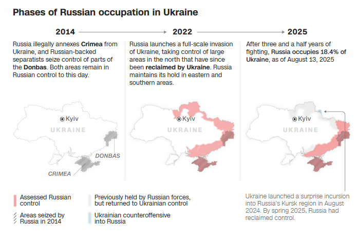 Президент США Дональд Трамп та президент Росії Володимир Путін зустрінуться у п’ятницю на саміті на Алясці, метою якого, принаймні з боку США, є припинення виснажливої війни, що розпочалася після повномасштабного вторгнення Росії у 2022 році. Будь-яка мирна угода щодо України повинна включати домовленість про територію, оскільки Росія наразі окупує майже п’яту частину території України.