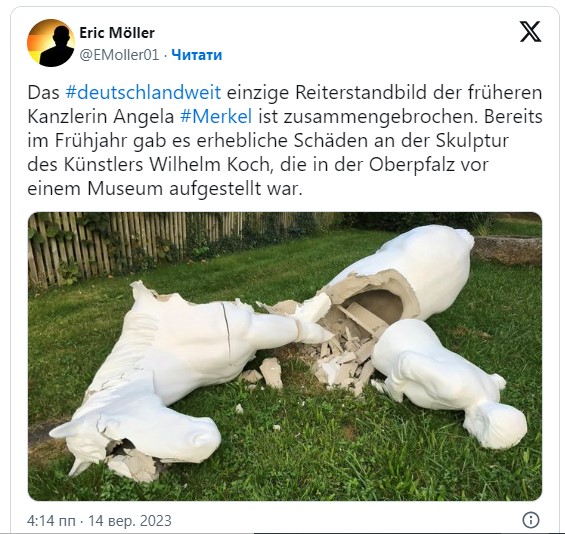 Кінна статуя колишнього канцлера Німеччини Ангели Меркель простояла в Баварії менш як два роки. Минулої ночі скульптура заввишки 2,70 метра в натуральну величину впала, як повідомив художник Вільгельм Кох.