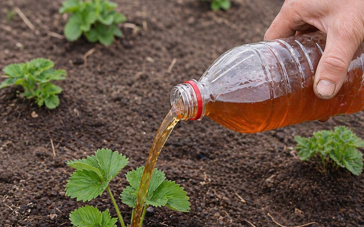 Підживлення легко приготувати самостійно. За складом і ефективністю вона не поступається магазинним добривам і містить усе необхідне для росту. Полуниця любить слабокислий ґрунт, тому добре реагує на такі варіанти добрива.