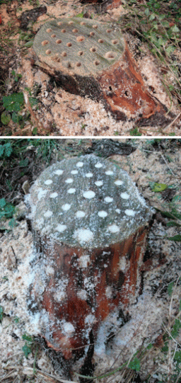 У дупло пня або в спеціально зроблені отвори засипте велику кількість натрієвої або калійної селітри.