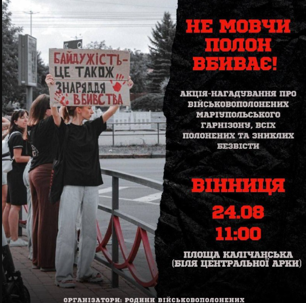 «Запрошуємо взяти участь в акції-нагадуванні про військовополонених Маріупольського гарнізону, всіх полонених та зниклих безвісти. Організатори акції: родини військовополонених 24 серпня, об 11:00, Площа Калічанська (біля Центральної арки). Боріться за них так, як вони боролись за вас!», – йдеться у повідомленні.