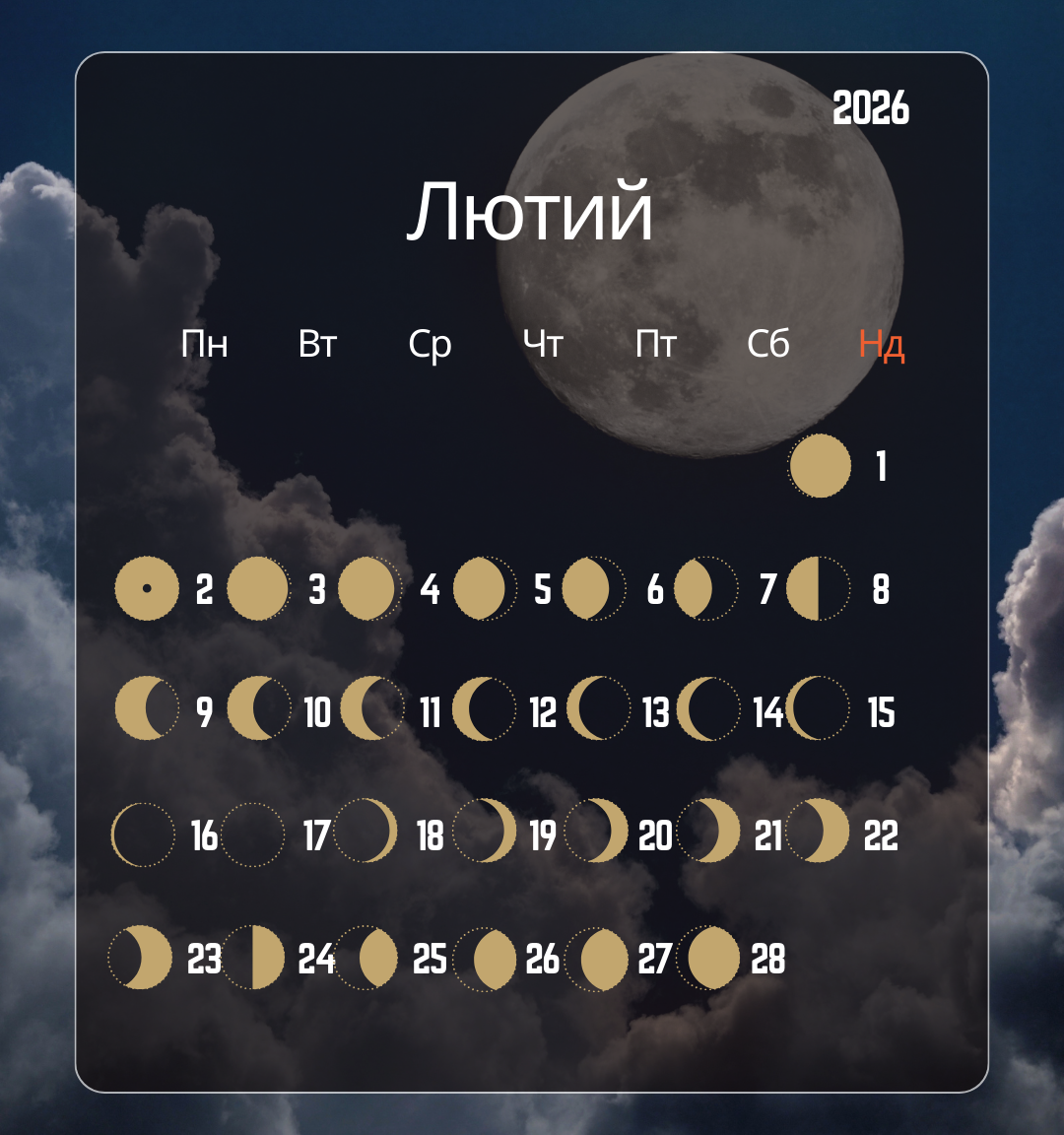 Поглянемо на фази земного супутника в лютому: