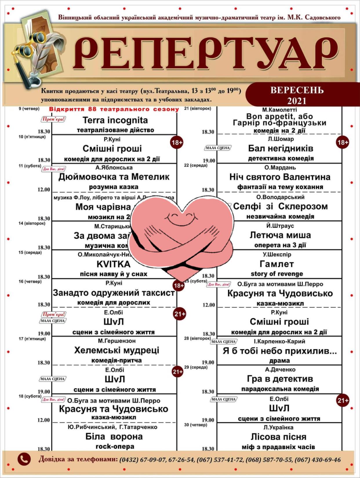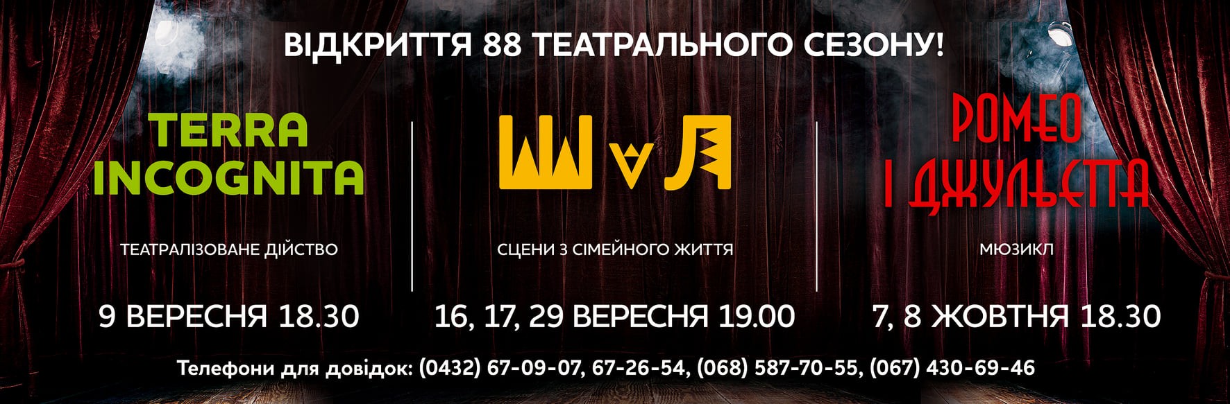 На початку сезону у Вінницькому академічному музично-драматичному театрі ім. М. Садовського також покажуть дві прем’єри: мюзикл “Ромео і Джульєтта” та виставу “ШvЛ” за п’єсою американського драматурга Едварда Олбі “Шлюбний етюд” (Marriage play).