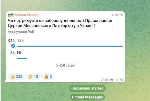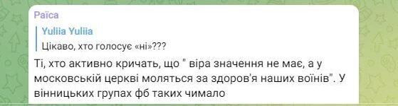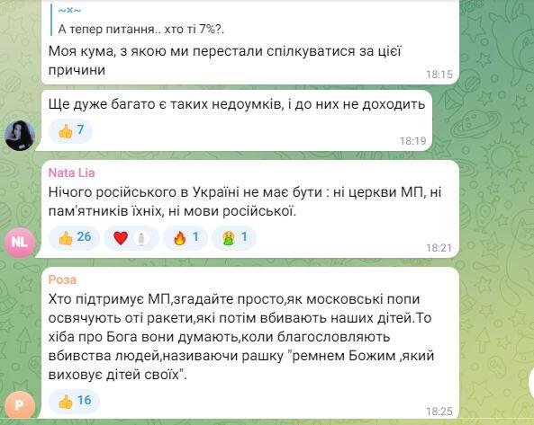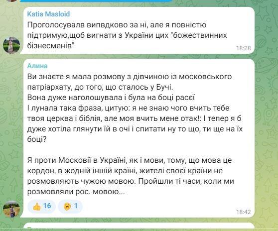 Ну і як годиться, у нашому Телеграм-каналі вінничани (ми до цієї категорії зараховуємо і вимушених переселенців, для яких Вінниця стала домівкою) не тільки голосували за припинення діяльності УПЦ МП, а й активно коментували свою громадянську позицію.