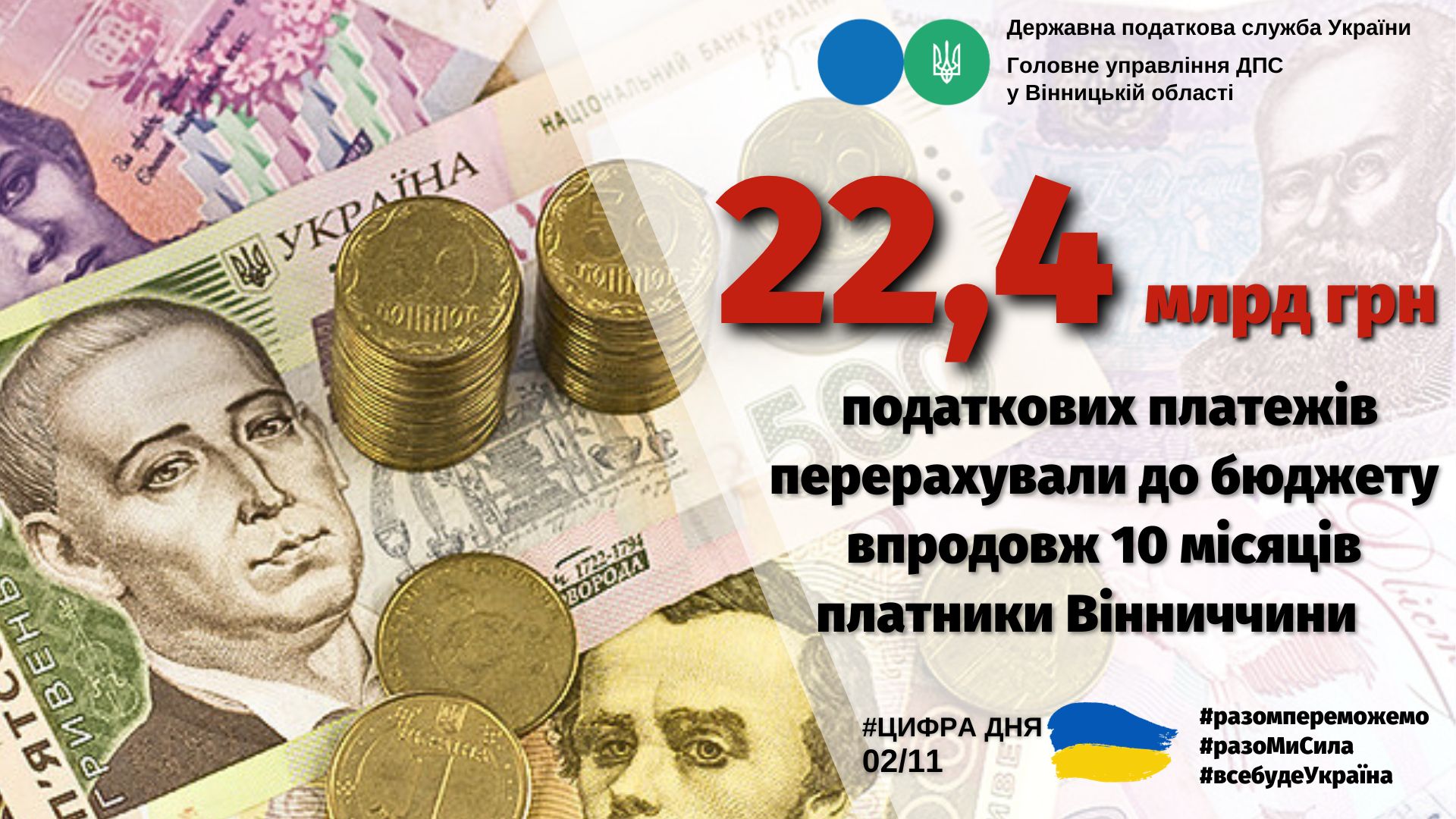 Упродовж січня-жовтня 2023 року платники податків Вінниччини перерахували до зведеного бюджету майже 22 млрд 402,2 млн грн податкових платежів,