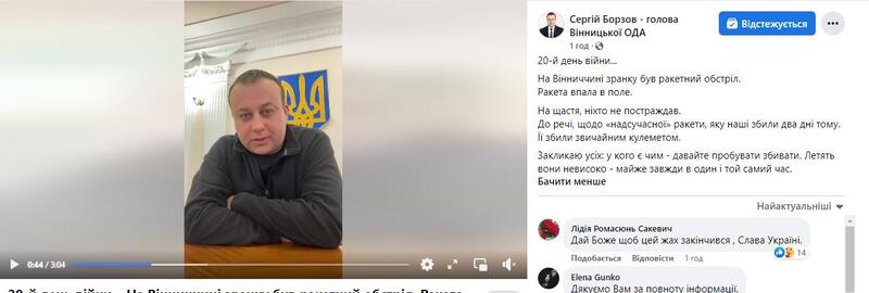 Начальник військової адміністрації у Вінницькій області Сергій Борзов розповів про новий ракетний обстріл Вінниччини. На щастя, російська крилата ракета впала в полі, не завдавши шкоди.