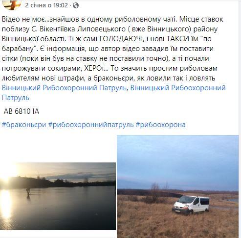Вінничанин оприлюднив в мережі Фейсбук відео, в якому браконьєри ставлять заборонені знаряддя лову. Йдеться про підлідні сітки. Події відбуваються на одному зі ставків Липовецької громади у Вінницькому районі. Громадянин зазначив, що відео побачив в одному із «браконьєрських» чатів.
