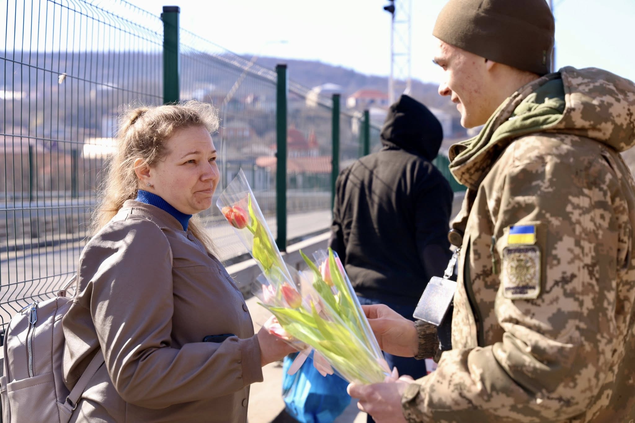 Тим, хто перетинав державний кордон, військовослужбовці дарували весняні квіти та щирі слова привітання.