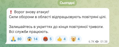 Залишайтесь в укриттях до кінця повітряної тривоги.