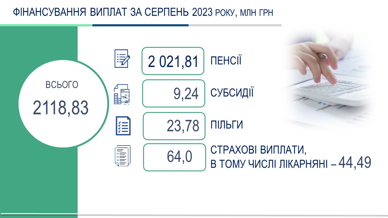 На фінансування видатків серпня 2023 року спрямовано 2118,83 млн грн, в тому числі на виплату:
