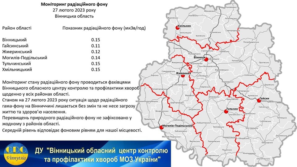 Станом на 27 лютого 2023 року показник становить від 0,11 мкЗв/год до 0,15 мкЗв/год, а це свідчить про те, що перевищень природного радіаційного фону не зафіксовано.