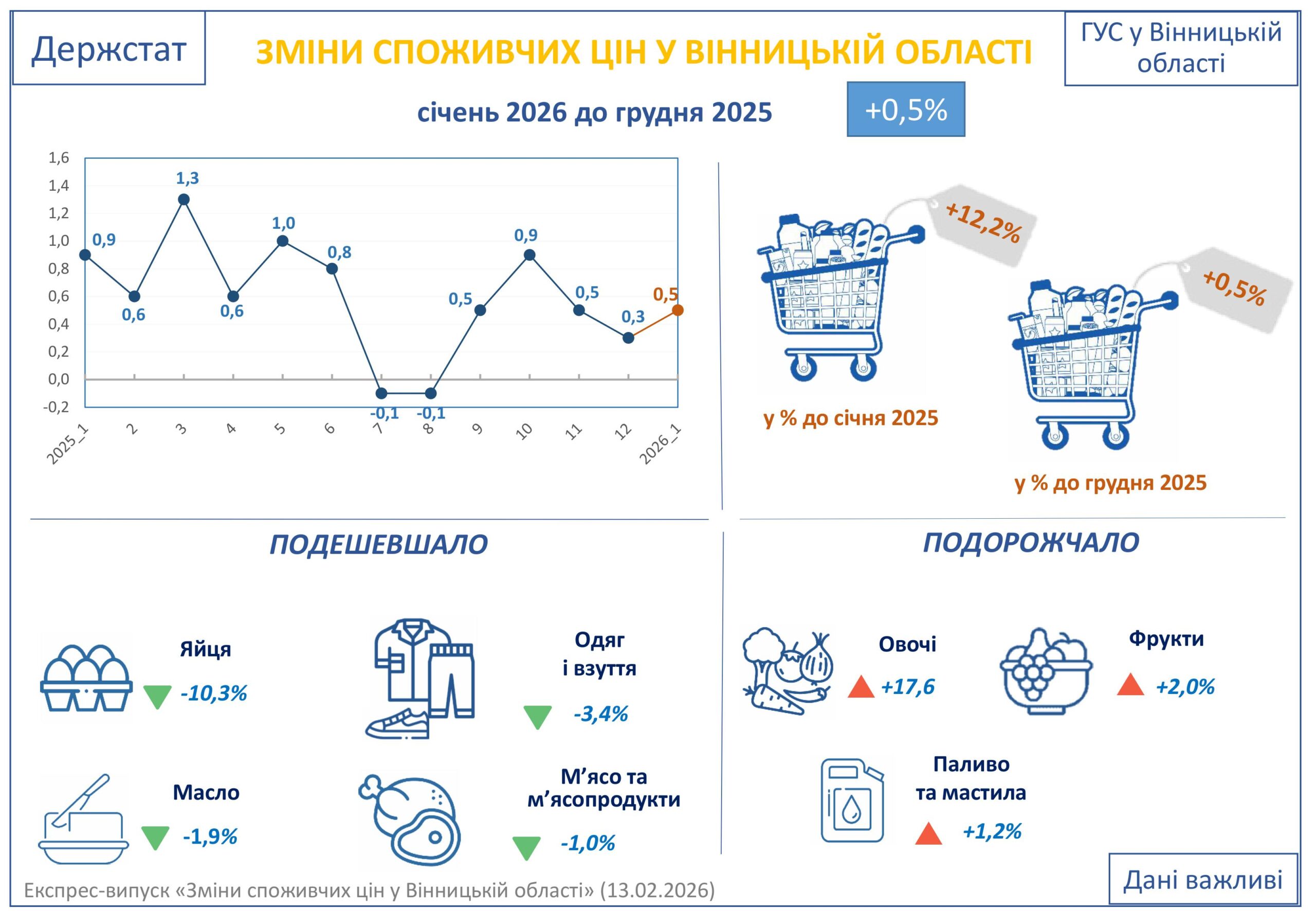 За розрахунками і повідомленням Держстату величина індексу споживчих цін (інфляція) у січні 2026р. порівняно із груднем 2025 року в Україні 100,7%, у Вінницькій області – 100,5%. На споживчому ринку області у січні ціни на продукти харчування та безалкогольні напої зросли на 0,5%.