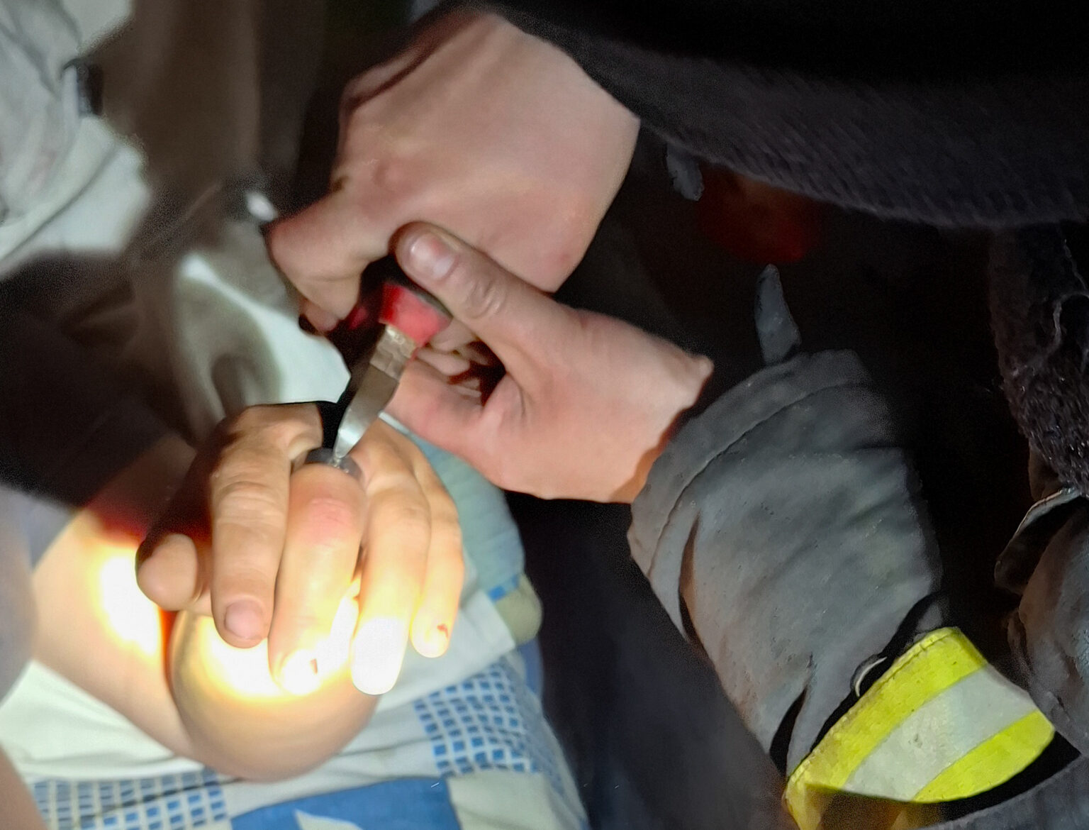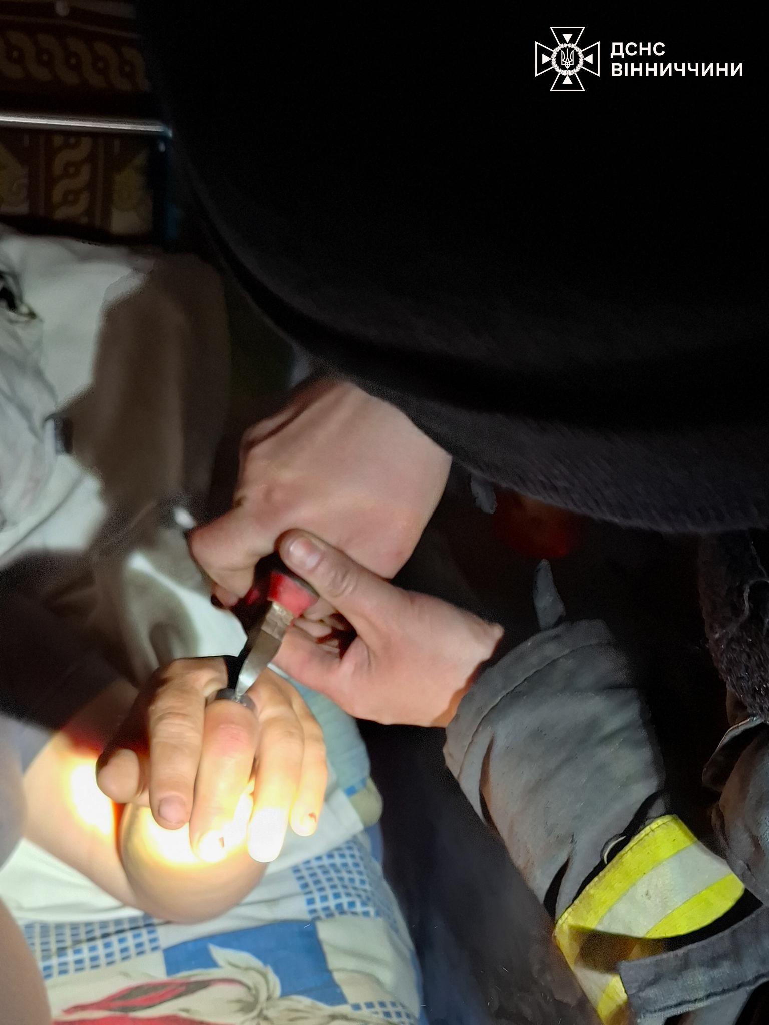 У селі Руданське Шаргородської громади 48-річна місцева жителька опинилася в незвичній ситуації — не змогла самостійно зняти металеву шайбу з пальця. Їй допомогу надавали рятувальники.