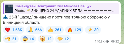 До цього Командування ПС ЗСУ оприлюднило інформацію про збиття 24 “Шахед”.