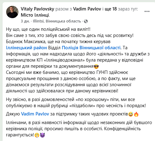 Сенсаційну інформацію про одного з місцевих керівників поліції повідомили у соціальних мережах. Йдеться про керівника іллінецької поліції. В кількох дописах йдеться про те, що керівника Іллінецького відділку поліції звільнили «через схиляння підлеглої до “дружніх стосунків”» також в дописах повідомляється, що ще й стало відомо про його корупційну діяльність.