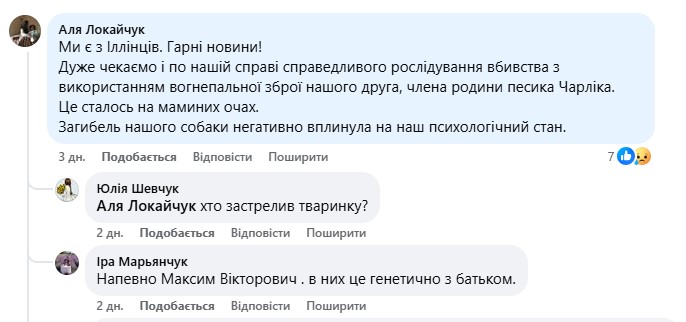 Ця тема жваво обговорюється у пабліках іллінчан. Крім «дружніх стосунків», поліцейському Максиму Боднюку також закидають вбивство песика однієї з мешканок громади.