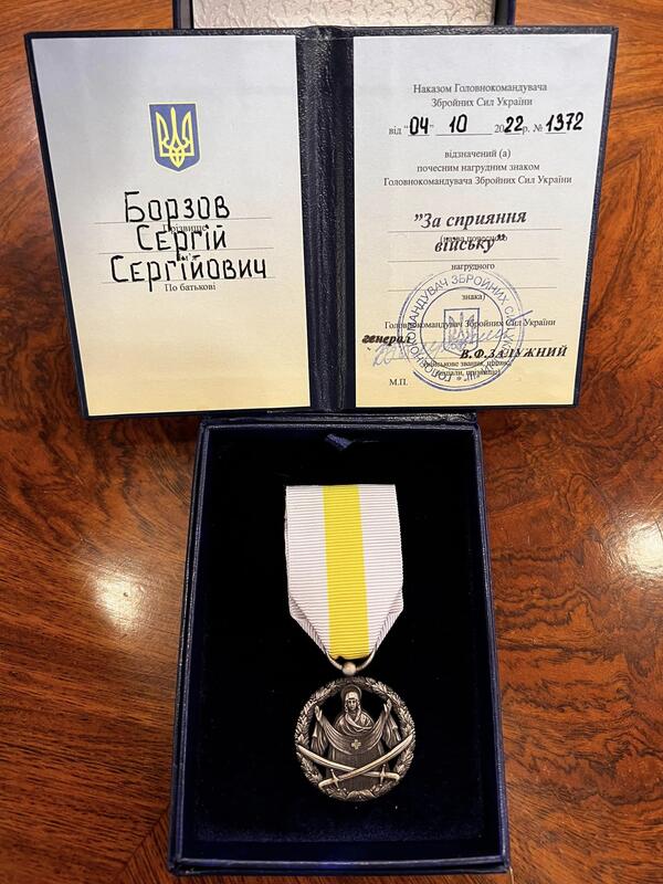 Начальник Вінницької ОВА Сергій Борзов розмістив у соціальних мережах допис, в якому він показав почесний нагрудний знак «За сприяння війську» та офіційні нагородні документи підписані головнокомандувачем Збройних сил України Валерієм Залужним.