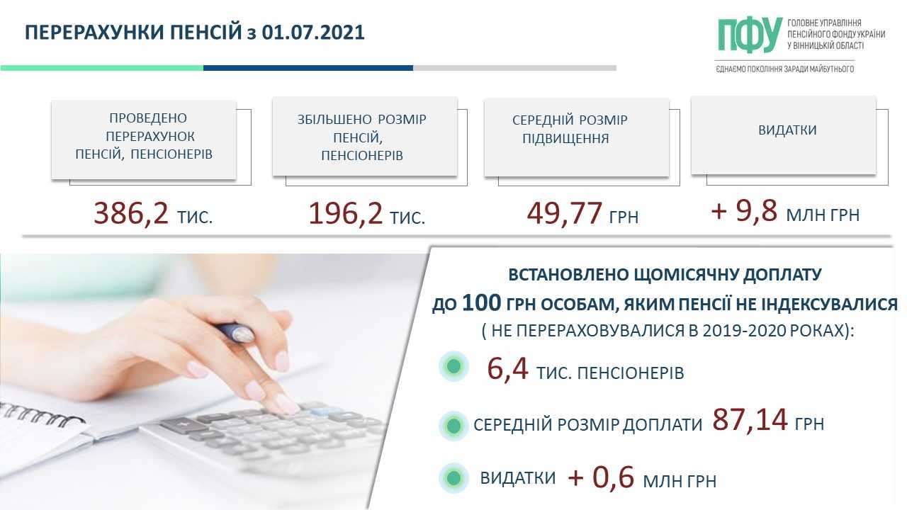 Перерахунок торкнувся 386,2 тис. осіб. Підвищення отримали 196,2 тис. громадян, або 44% від загальної чисельності пенсіонерів Вінницької області, його середній розмір – 49,77 грн. Додаткові видатки для забезпечення перерахунку пенсій склали 9,8 млн грн.