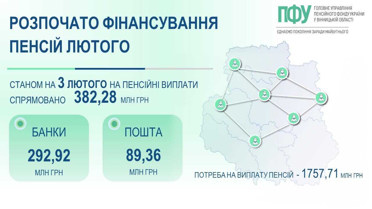 Пенсійним фондом України розпочато фінансування пенсій за лютий 2023 року. Загальна потреба коштів на виплату пенсіонерам Вінниччини пенсій лютого – 1757,71 млн грн. У області почали виплату пенсій. Вона буде здійснюватись з 4 по 25 лютого банківськими установами та підприємствами поштового зв’язку.
