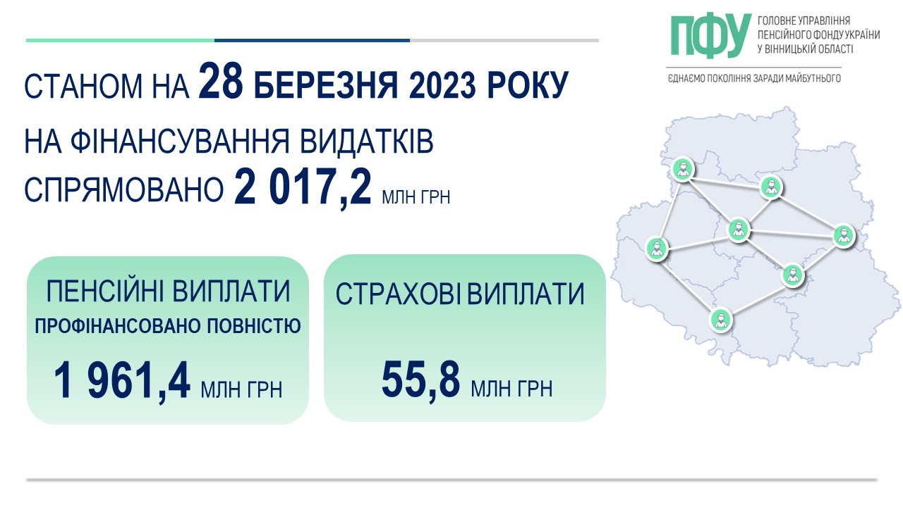 Пенсійним фондом України завершено фінансування березневих пенсій. Станом на 29 березня 2023 року пенсіонерам Вінницької області на пенсійні виплати спрямовано 1 961,4 млн грн.