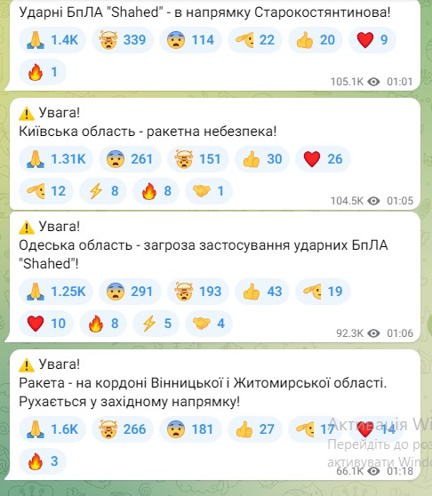 «Ракета – на кордоні Вінницької та Житомирської області. Рухається у західному напрямку!», – йшлося у повідомленні.