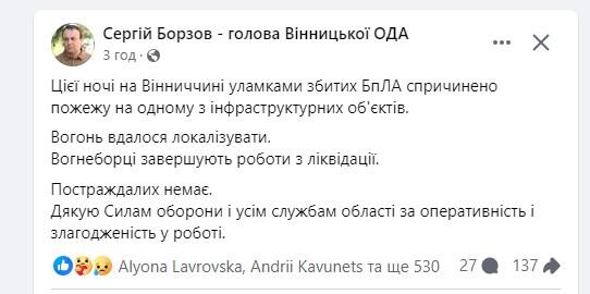 Цієї ночі на Вінниччині через уламки збитих БпЛА сталася пожежа на одному з інфраструктурних об’єктів у Калинівській громаді. Постраждалих немає.