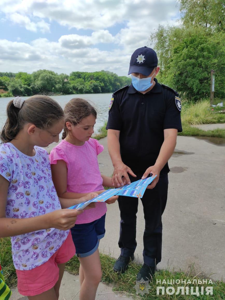 Поліцейські разом з рятувальниками продовжують перевіряти місця відпочинку та нагадують дітям і їхнім батькам основні правила поведінки в таких місцях.