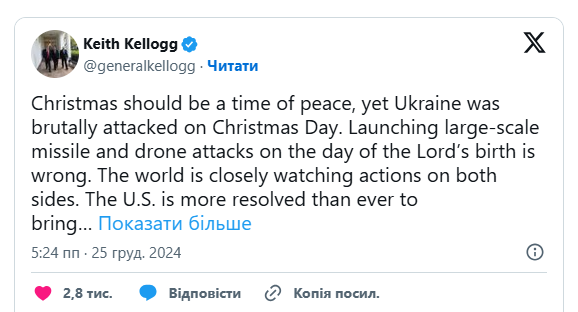 Обраний Дональдом Трампом спецпредставник з питань Росії та України генерал Кіт Келлог засудив масовану ракетну атаку Росії проти України на Різдво.