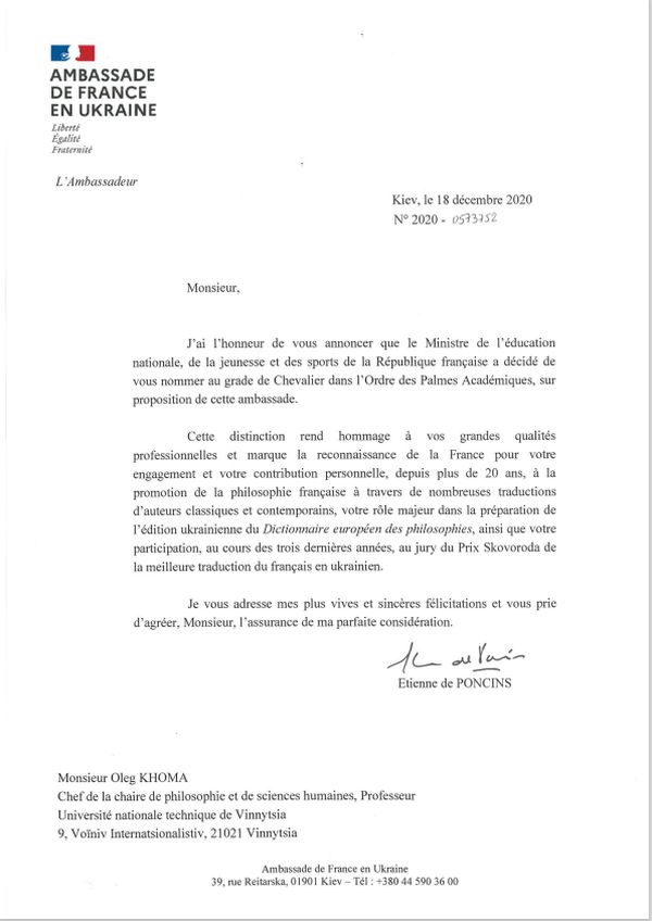 «Міністр освіти, молоді та спорту Французької Республіки п. Жан-Мішель Бланке удостоїв завідувача кафедри філософії і гуманітарних наук ВНТУ п. Олега Хому звання кавалера ордена «Академічних пальм» «на вшанування високих професійних якостей» і «на знак вдячності від Франції» за особисті — понад двадцятилітні зусилля з поширення французької філософії шляхом перекладу класичних і сучасних авторів, вагому роль в підготовці українського видання «Європейського словника філософій», а також за участь протягом останніх трьох років у журі премії «Сковорода», котру присуджує посольство Франції в Україні».