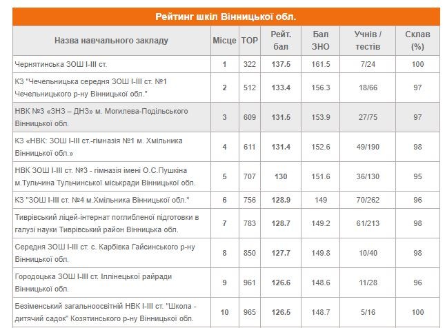 Інформаційним освітнім ресурсом «Освіта.ua» складено рейтинг загальноосвітніх шкіл Вінницької області, що посіли найвищі місця у рейтингу шкіл України за підсумками ЗНО 2021 року.