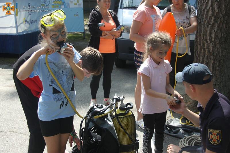 Водолази ознайомили всіх з основними правилами безпечного відпочинку на воді, а також розповіли, як працює спеціальне спорядження для занурення під воду та порятунку людей. Також маленькі відпочивальники дізналися, як правильно розпізнати людину, яка тоне, та як її врятувати.