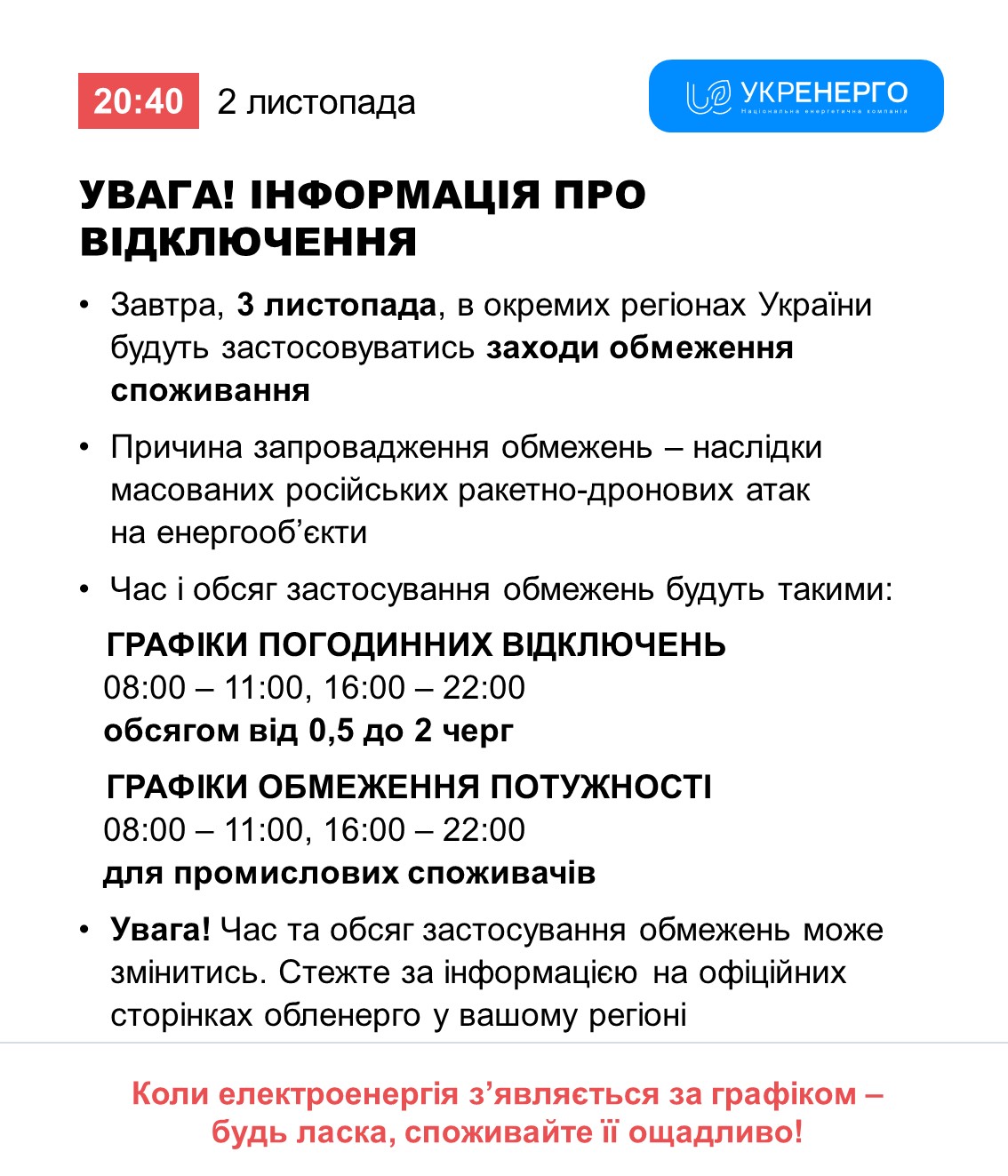 Сьогодні ж, 3 листопада, введення графіків погодинних відключень для споживачів Вінницької області теж не планується. Також не обмежуватимуть споживання для промисловості та бізнесу.