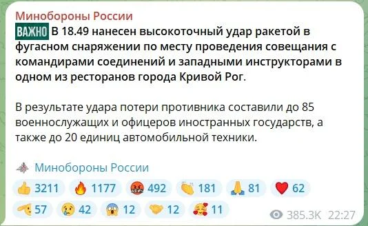 Після удару по Кривому Рогу російське Міністерство оборони РФ заявило, що це був “високоточний удар”, а його метою була “нарада командирів і західних інструкторів” в одному з ресторанів міста.