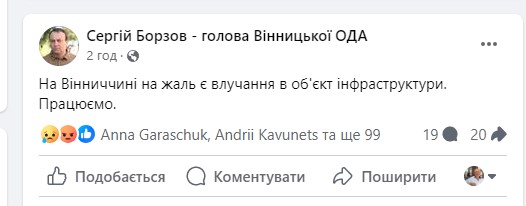 Про влучання також повідомив й начальник Вінницької ОВА Сергій Борзов.