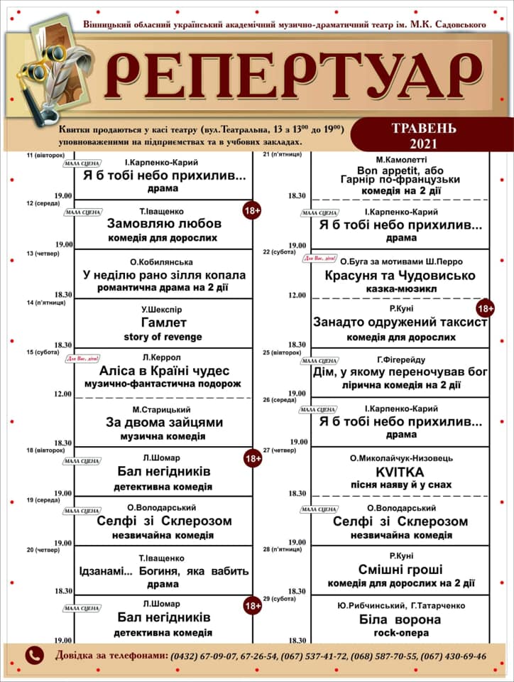 P.S. Усі квитки, які ви, вельмишановні глядачі, придбали на вистави березня, є дійсними! Лише обов’язково потрібно їх перереєструвати! Каса працює у звичному режимі!