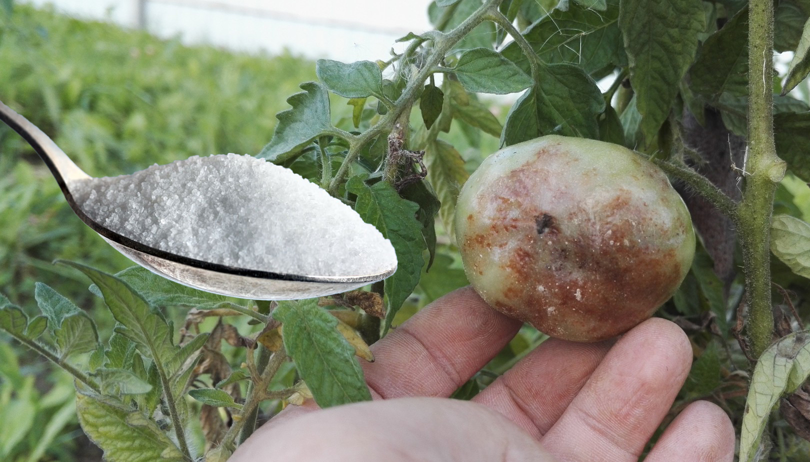 1 склянку солі розчиняють у 10 літрах води та обприскують цим розчином великі, але ще зелені плоди один раз на місяць.