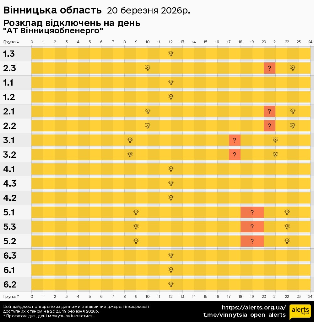 Графіки відключення світла 20 березня запровадять у Вінницькій області в період з 17:00 до 21:00. Для промислових споживачів діятимуть графіки обмеження потужності з ранку 08:00 до 24:00.