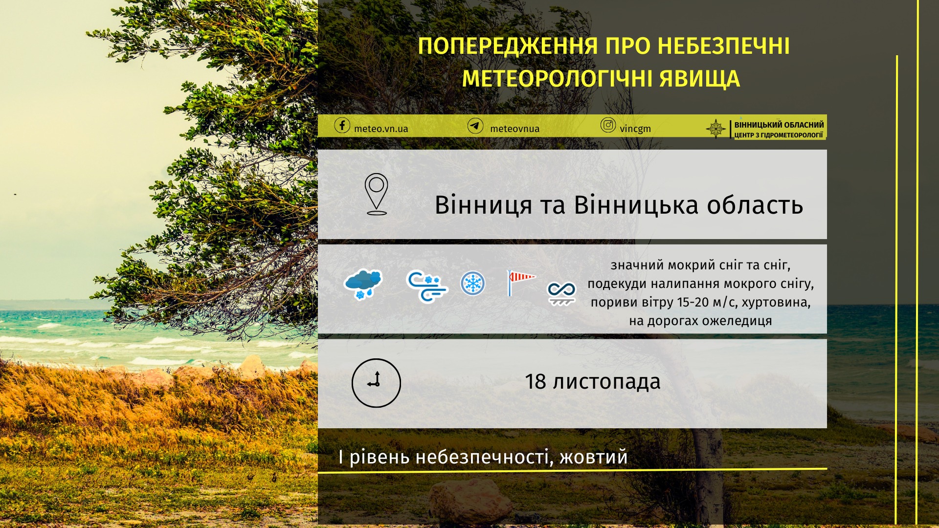 У суботу, 18 листопада, по Вінницькій області та місту Вінниця очікується ускладнення погодних умов: значний мокрий сніг, утворення снігового покриву 5-10 см, подекуди налипання мокрого снігу, на дорогах ожеледиця, пориви вітру 15-20 м/с, хуртовина (1 рівень небезпечності, жовтий).