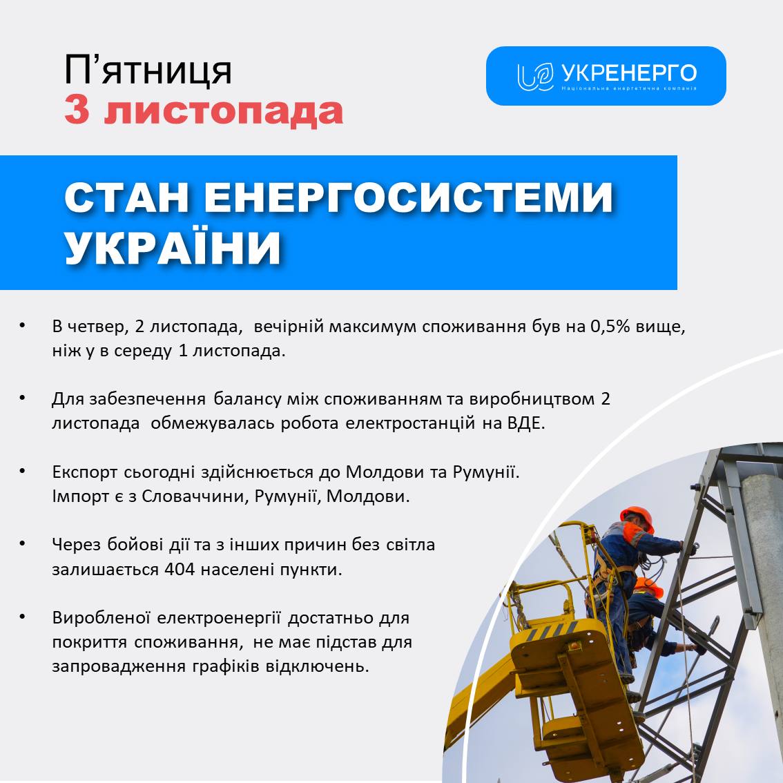 Загалом через бойові дії та з інших причин без світла залишається 404 населені пункти. Через обстріли є пошкодження в мережах обленерго в Дніпропетровській, Донецькій, Харківській, Херсонській областях. Також через обстріли є окремі знеструмлені споживачі в м. Харків», – йдеться у повідомленні.