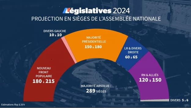 Прогноз Ifop, який наводить Le Figaro, дає лівим від 180 до 215 місць, блоку “Разом” – 150-180 місць, “Національному об’єднанню” – від 120 до 150 мандатів.