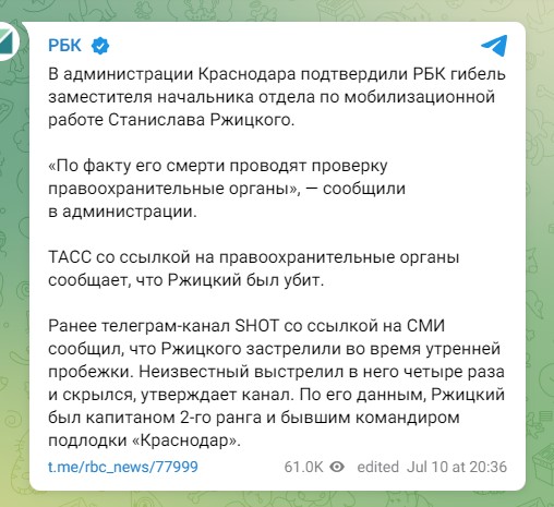 «В адміністрації Краснодара підтвердили РБК загибель заступника начальника відділу мобілізаційної роботи Станіслава Ржицького. “За фактом його смерті проводять перевірку правоохоронні органи”, – повідомили в адміністрації», – йдеться у повідомленні.