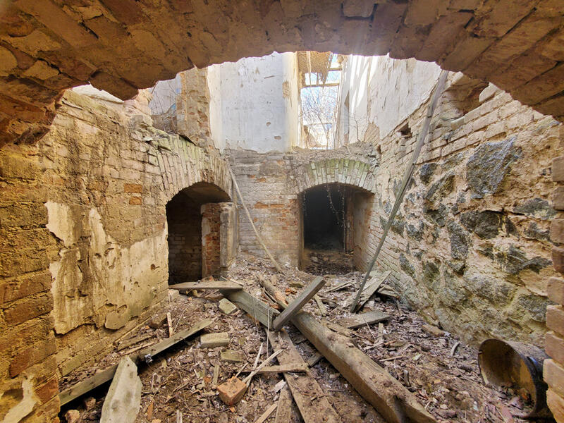 Можна уявно реконструювати головний вхід із колонами іонічного чи коринфського ордера, веранду (з іншого боку) з колонами, ліпнину внутрішніх приміщень, рештки якої ще лишились. Ну а велична башта, неймовірні склепіння підвалів. Ех, якби ж то усе було цілим…